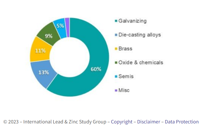 Zinc’s effectiveness in protecting steel against corrosion by galvanising is well recognised, while its ability to die cast complicated components makes zinc indispensable in a multitude of industry and household products. It also has important markets in the brass and construction industries and in chemicals and constitutes an essential nutritional element. Zinc’s main end uses are shown in the chart below.