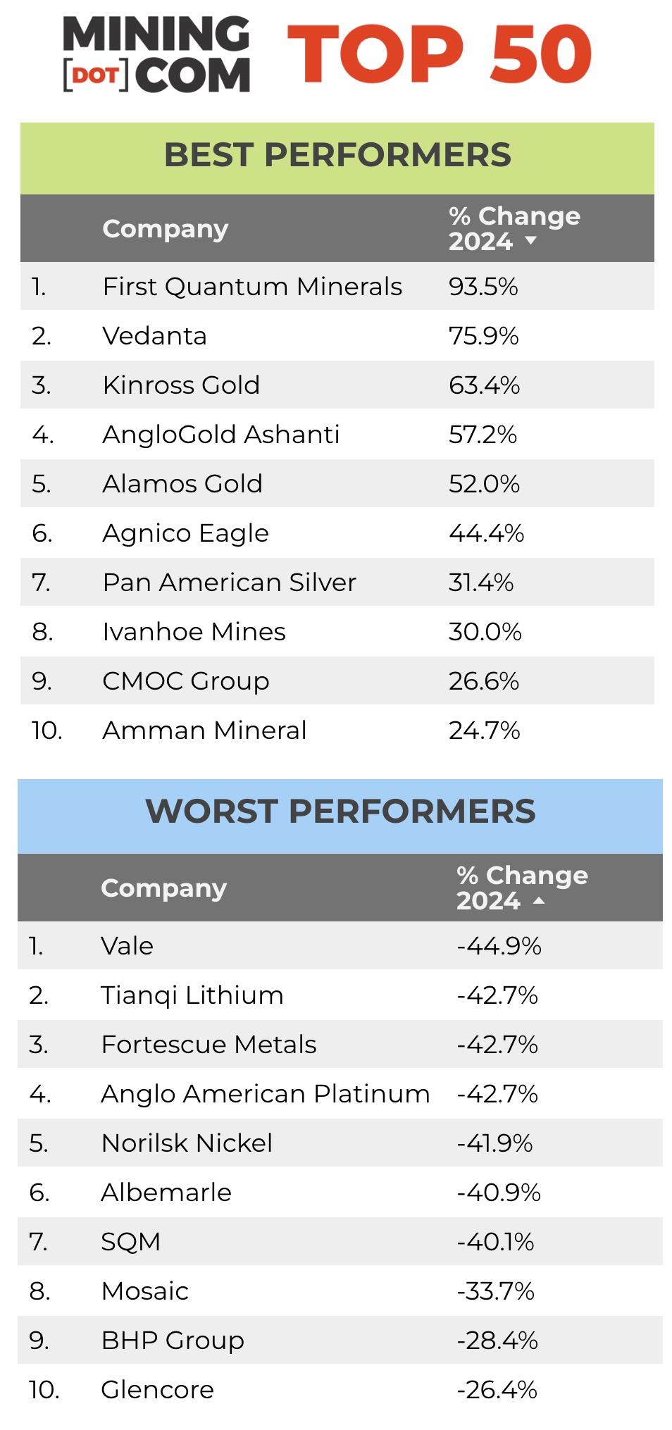 The rampant dollar over the final months of 2024 only compounded losses: MINING.COM’s Top 50 considers performance in US$ market capitalisation terms, not share price changes in local currency on domestic exchanges.
