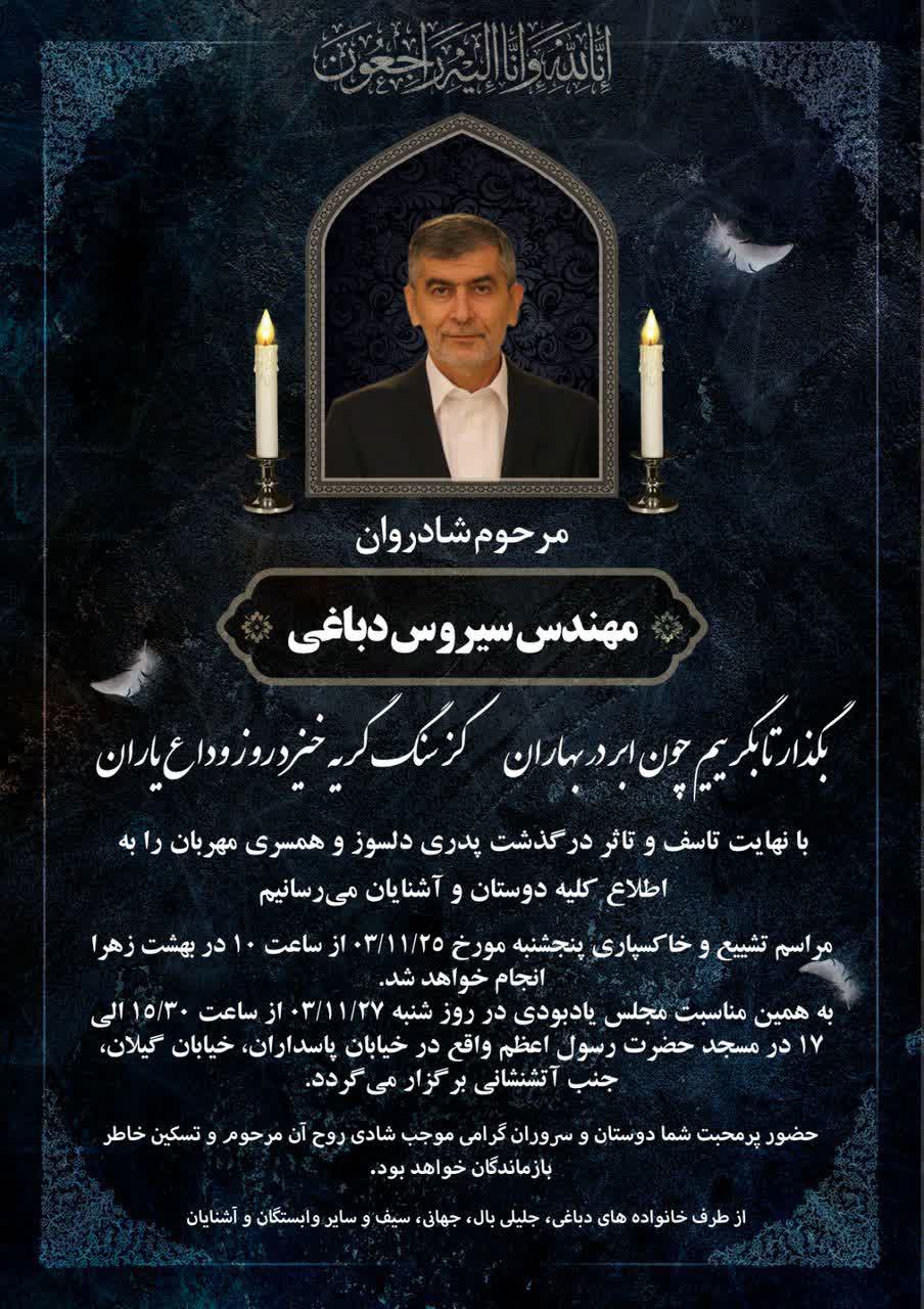 پیام تسلیت هیات مدیره انجمن صنایع و معادن سرب و روی ایران در پی درگذشت مرحوم مغفور، جناب آقای مهندس سیروس دباغ