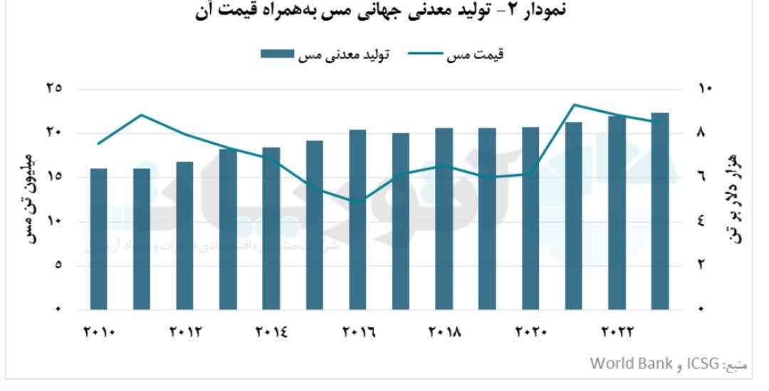 نمودار ۲، بیانگر تولید معدنی مس به همراه قیمت آن است. روند تولید معدنی مس دنیا با نرخ رشد مرکب ۲٫۶ درصد، صعودی بوده است. گفته میشود که در سال ۲۰۱۰، تولید معدنی مس دنیا حدود ۱۶ میلیون و ۱۰۰ هزار تن بود و کمترین تولید معدنی مس دنیا طی دوره مورد بررسی، در سال ۲۰۱۰ و بیشترین آن در سال ۲۰۲۳ عنوان شد. در سال ۲۰۲۳، این شاخص به ۲۲ میلیون و ۴۰۰ هزار تن رسید که نسبت به سال قبل از آن، حدود ۲٫۱ درصد رشد داشت. ناگفته نماند که در سال ۲۰۱۳ نسبت به سال ۲۰۱۲، بیشترین رشد تولید معدنی مس و حدود ۸٫۴ درصد رقم خورد و تولید معدنی فلز سرخ در این سال، به حدود ۱۸ میلیون و ۲۰۰ هزار تن رسید.