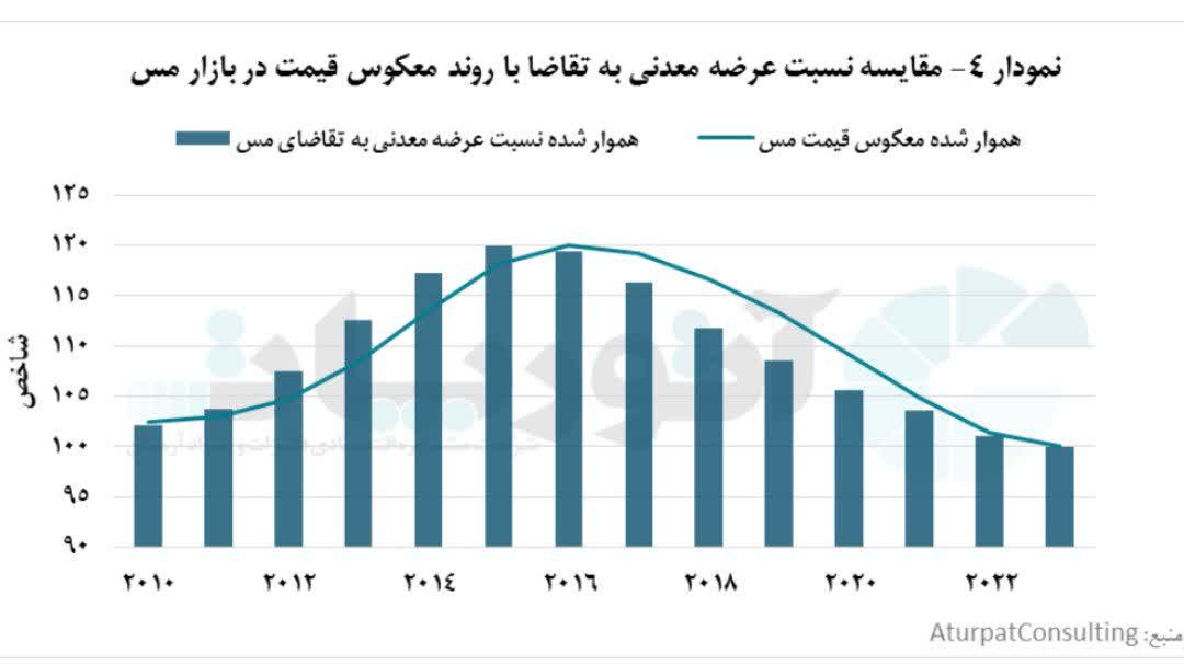 در نمودار ۴ مشابه با نمودار ۳، روند نسبت عرضه معدنی به تقاضای با روند معکوس قیمت آن مشاهده میشود. از سال ابتدایی دوره مورد بررسی تا اواسط دوره مورد بررسی، روند معکوس قیمت و شاخص نسبت عرضه معدنی به تقاضای مس افزایشی بوده اما پس از آن، به طور مداوم کاهش یافته است. لازم به یادآوری است که روند تولید معدنی مس در طول دوره مورد بررسی صعودی بوده است. در نتیجه، افزایش شاخص نسبت عرضه معدنی به تقاضای مس تا اواسط دوره مورد بررسی، ناشی از افول تقاضا بوده و بهدنبال آن، قیمت مس نیز کاهش یافته است اما طی نیمه دوم از دوره مورد بررسی، افزایش تقاضای مس منجر به رشد قیمت این فلز در بازارهای دنیا شده است.