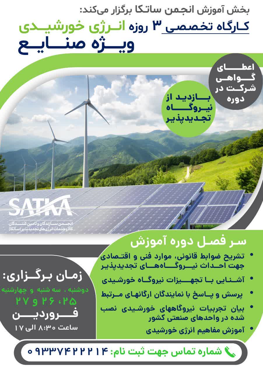 به استحضار میرساند، انجمن سازندگان و تامین کنندگان کالا و خدمات انرژی های تجدید پذیر(ساتکا)، هفتمین دوره از کارگاه های تخصصی سه روزه انرژی های تجدید پذیر برای صنایع به همراه بازدید از نیروگاه تجدید پذیر را در روزهای دوشنبه و سه شنبه و چهارشنبه مورخ 25 ، 26 و 27 فروردین 1404 در محل کارگاه های آموزشی انجمن ساتکا در تهران از ساعت 8:30 الی 17 برگزار می نماید.