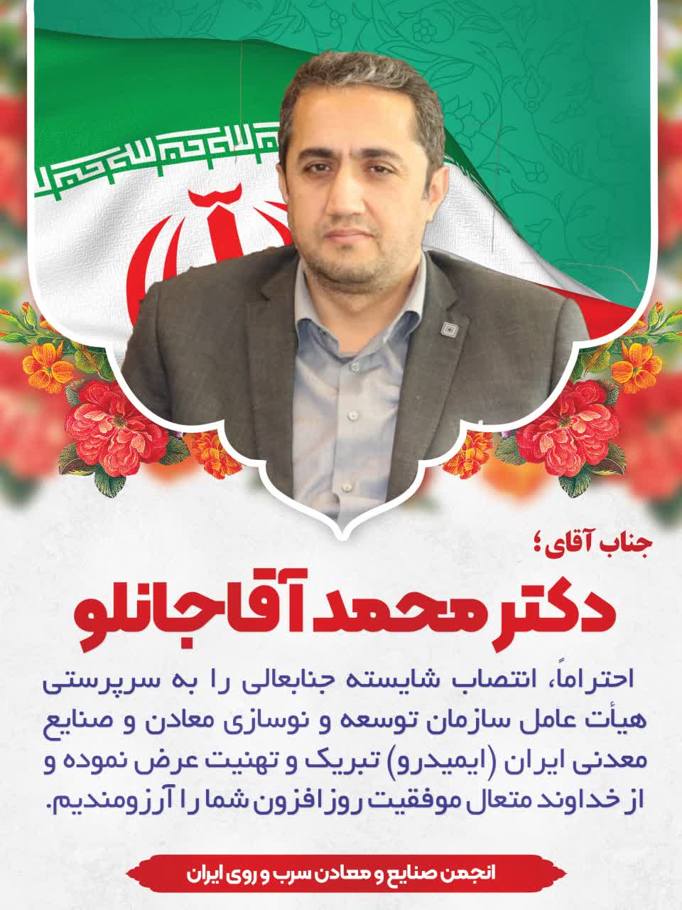 جناب آقای دکتر محمد آقاجانلو احتراما انتصاب شایسته جنابعالی را به سرپرستی هیات عامل سازمان توسعه و نوسازی معادن و صنایع معدنی ایران (ایمیدرو) تبریک و تهنیت عرض نموده و از خداوند متعال موفقیت روز افزون شمارا آرزومندیم.
