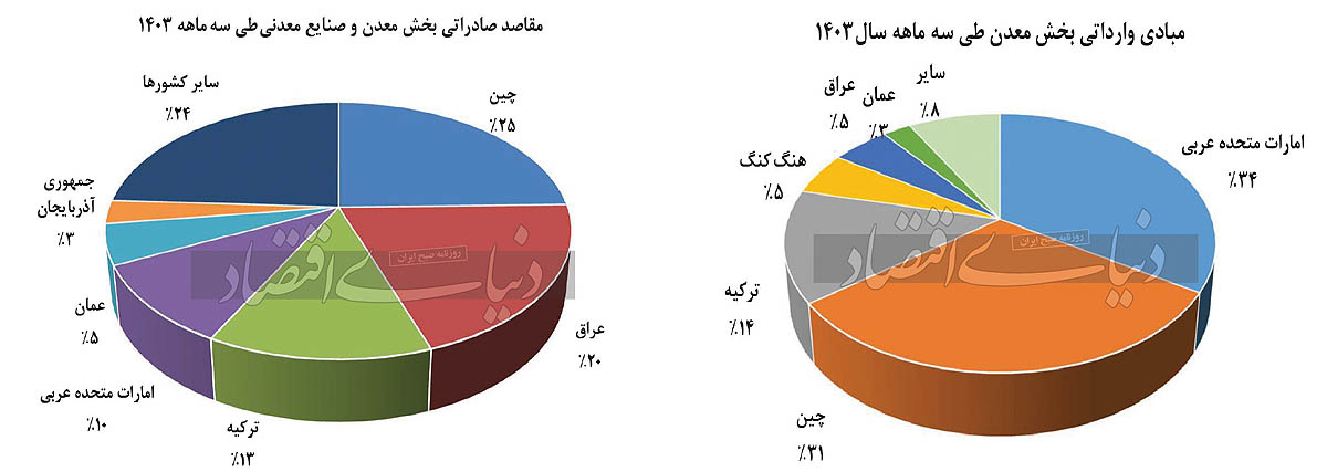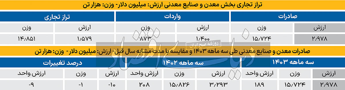 معدن: مجموع صادرات معدن در سهماهه 1403، 523میلیون دلار به وزن 7میلیون و 204هزار تن بودهاست که در مجموع سهم ارزشی 3.9درصدی از کل صادرات داشتهاست. صادرات این بخش به لحاظ ارزشی 10درصد (56میلیون دلار) کاهش و به لحاظ وزنی 3درصد (214هزار تن) نسبت به مدت مشابه سالگذشته افزایش داشتهاست.
