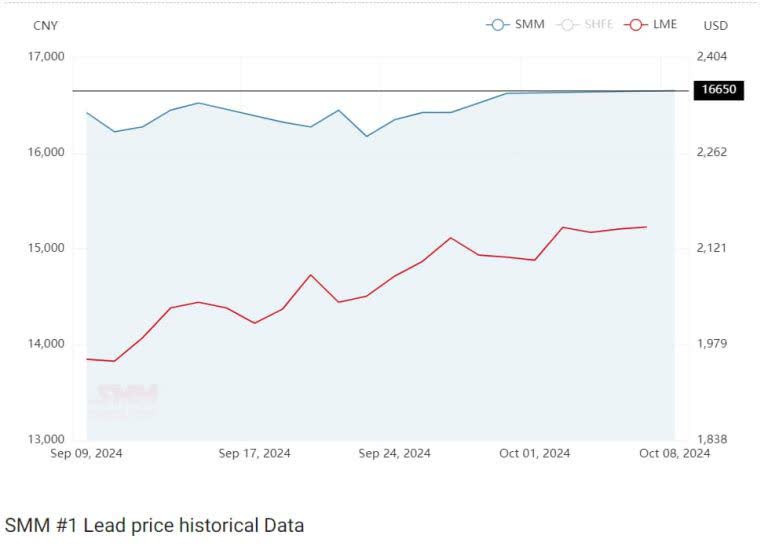 LME:در بورس فلزات لندن، قیمت سرب روند افزایشی داشت و با ۵۲ دلار افزایش نسبت به هفته گذشته در ۷ اکتبر به ۲,۱۴۸ دلار رسید. موجودی سرب انبار LME در این هفته کاهش یافت.
