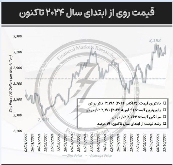 قیمت روی در تاریخ ۲۵ اکتبر برابر با با ۳۱۰۷ دلار در هر تن بوده که نسبت به ۰۲ ژانویه ۲۰۲۴، ۱۹ درصد رشد داشته است.