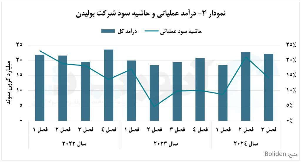 درآمد عملیاتی شرکت بولیدن در طول بازه مورد بررسی، با میانگین ۲۱ میلیارد و ۶۰۰ میلیون کرون سوئد نوسانی بوده است. بیشترین درآمد عملیاتی شرکت در فصل چهارم سال ۲۰۲۲، با ۲۳ میلیارد و ۵۷۷ میلیون کرون سوئد ثبت شد. درآمد کل عملیاتی شرکت بولیدن در فصل سوم سال ۲۰۲۴، به ۲۲ میلیارد و ۲۰۰ میلیون کرون سوئد رسید؛ در حالی که در فصل سوم سال ۲۰۲۳، این شرکت حدود ۱۹ میلیارد و ۴۰۰ میلیون کرون سوئد درآمد کسب کرد. علت این امر، افزایش قیمت روی در فصل سوم سال ۲۰۲۴ نسبت به ۲۰۲۳ بود. گفتنی است که درآمد شرکت در فصل سوم سال ۲۰۲۴ نسبت به فصل دوم آن، حدود ۵۵۵ میلیون کرون کاهش پیدا کرد که کاهش تولید و فروش روی در این فصل، یکی از عوامل موثر بر کاهش درآمد بود.