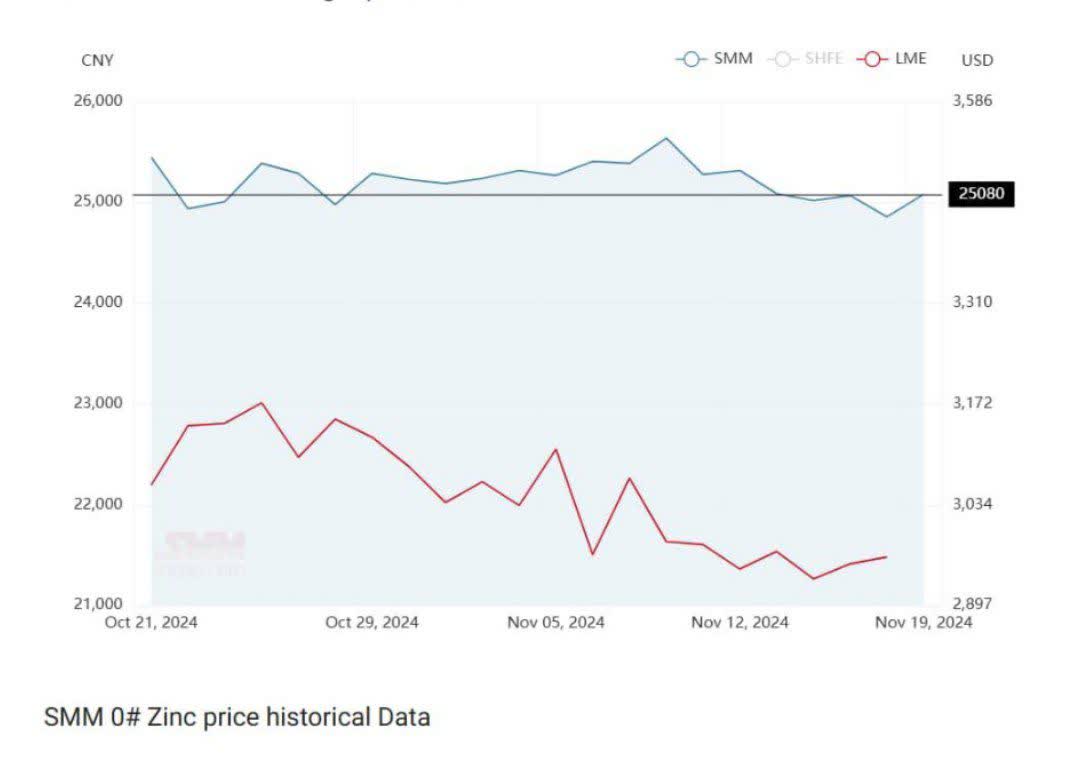 در بورس فلزات شانگهای قیمت روی روند کاهشی داشت و با 41 دلار کاهش نسبت هفته گذشته، در 19 نوامبر به 3,459 دلار (شامل 13 درصد مالیات VAT) رسید. کمبود تقاضا، افزایش فشار ناشی از داده های اقتصادی و افزایش موجودی، بر قیمت روی موثر بود.
