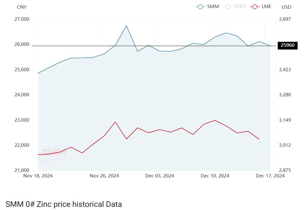 در بورس فلزات شانگهای قیمت روی در این هفته روند کاهشی داشت و با ۵۸ دلار کاهشی نسبت هفته گذشته، در ۱۷ دسامبر به ۳,۵۵۵ دلار (شامل ۱۳ درصد مالیات VAT) رسید. کاهش موجودی روی در SMM، روند نزولی قیمت آن را محدود کرد.