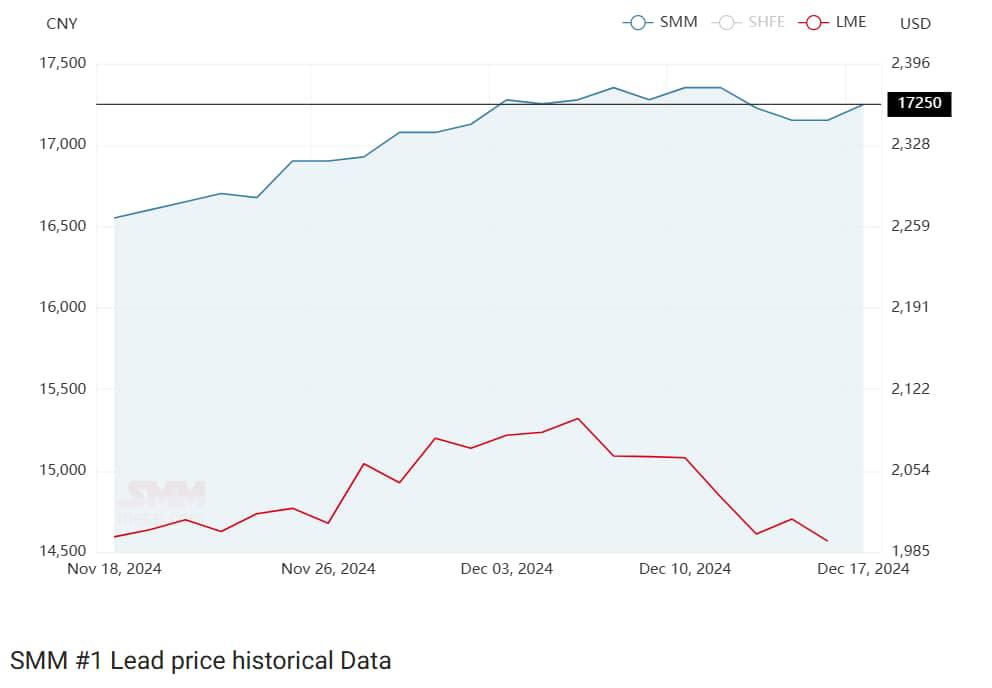 در بورس فلزات شانگهای قیمت سرب در این هفته روند کاهشی داشت و با ۲۱ دلار کاهش نسبت به هفته گذشته در ۱۷ دسامبر به ۲,۳۶۲ دلار (شامل ۱۳ درصد مالیات VAT) رسید. با محدودیت در تامین مواد خام اولیه و کاهش نرخ تولید، کاهش موجودی شمش سرب از قیمت آن حمایت می کند.