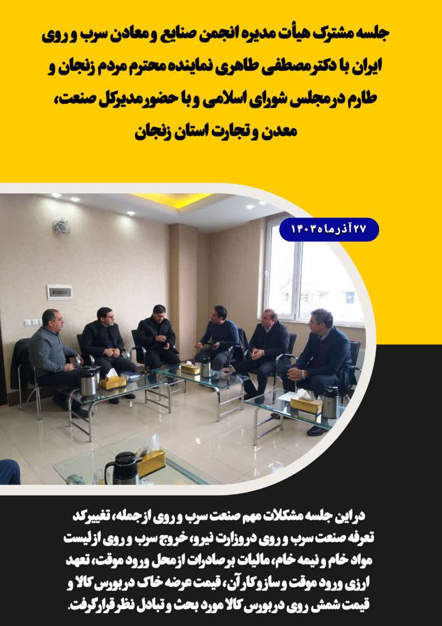 جلسه مشترک هیات مدیره انجمن صنایع و معادن سرب و روی ایران با دکتر مصطفی طاهری نماینده محترم مردم زنجان و طارم در مجلس شورای اسلامی و با حضور مدیر کل محترم صنعت،معدن و تجارت استان زنجان